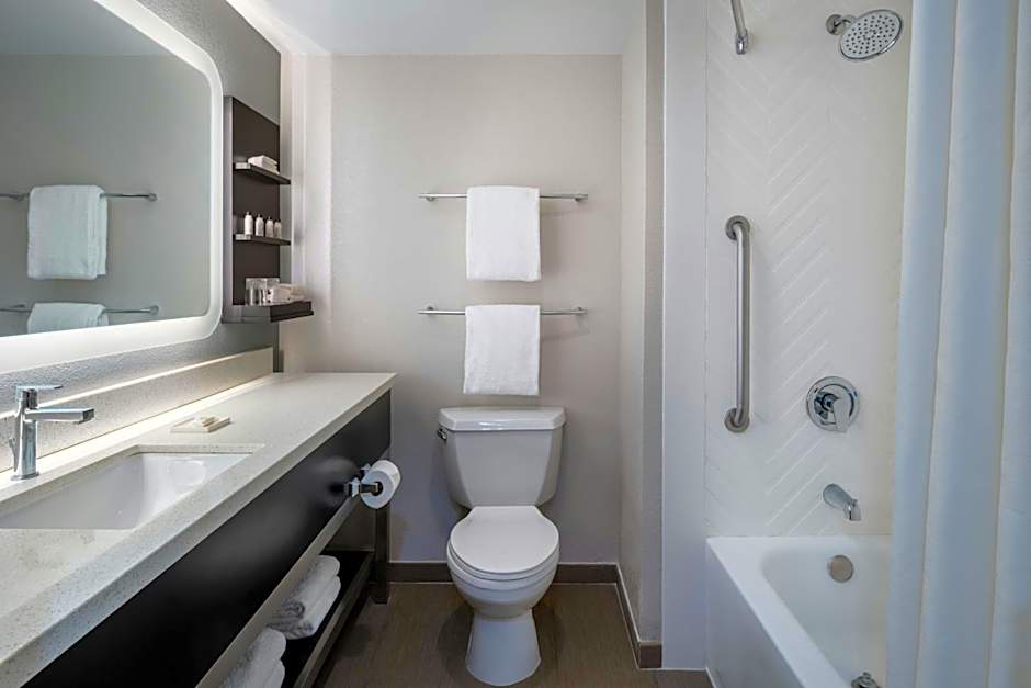 This disability accessible guestroom includes a microwave, small refrigerator and private bathroom with an accessible bath.